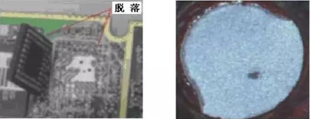這種焊點(diǎn),釬料是黏附在焊盤(pán)表面上的,有時(shí)表現(xiàn)得毫無(wú)連接強(qiáng)度可言。圖為一塊PCBA上的CSP芯片,由于冷焊,一受力芯片便撕裂下來(lái)。器件與焊盤(pán)分離后,焊盤(pán)表面潔凈且呈金屬光澤,如右圖所示。它與分離后的虛焊點(diǎn)的焊盤(pán)表面是完全不同的。