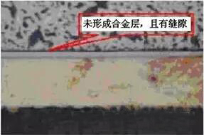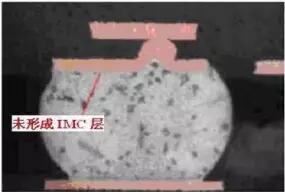 冷焊發(fā)生的原因主要是焊接時(shí)熱量供給不足,焊接溫度未達(dá)到釬料的潤(rùn)濕溫度,因而結(jié)合界面上沒(méi)有形成IMC或IMC過(guò)薄,如左圖所示。有的情況下,界面上還存在著裂縫,如圖所示。