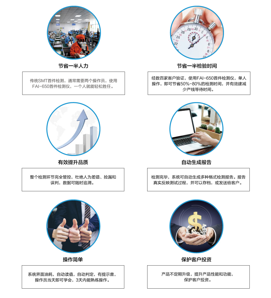 當今SMT電子工廠,多機種、小批量、換線頻,使得首件檢測的任務越發(fā)繁重。傳統(tǒng)的SMT首件檢測方法,不僅浪費人力,效率低下,整個首件檢測過程缺乏管控,品質(zhì)難以得到保證。針對此難題,深圳市藍眼科技有限公司首創(chuàng)了SMT首件檢測儀,通過不斷升級優(yōu)化,現(xiàn)已研發(fā)出第四代首件檢測儀FAI-650,具有以下顯著優(yōu)勢: