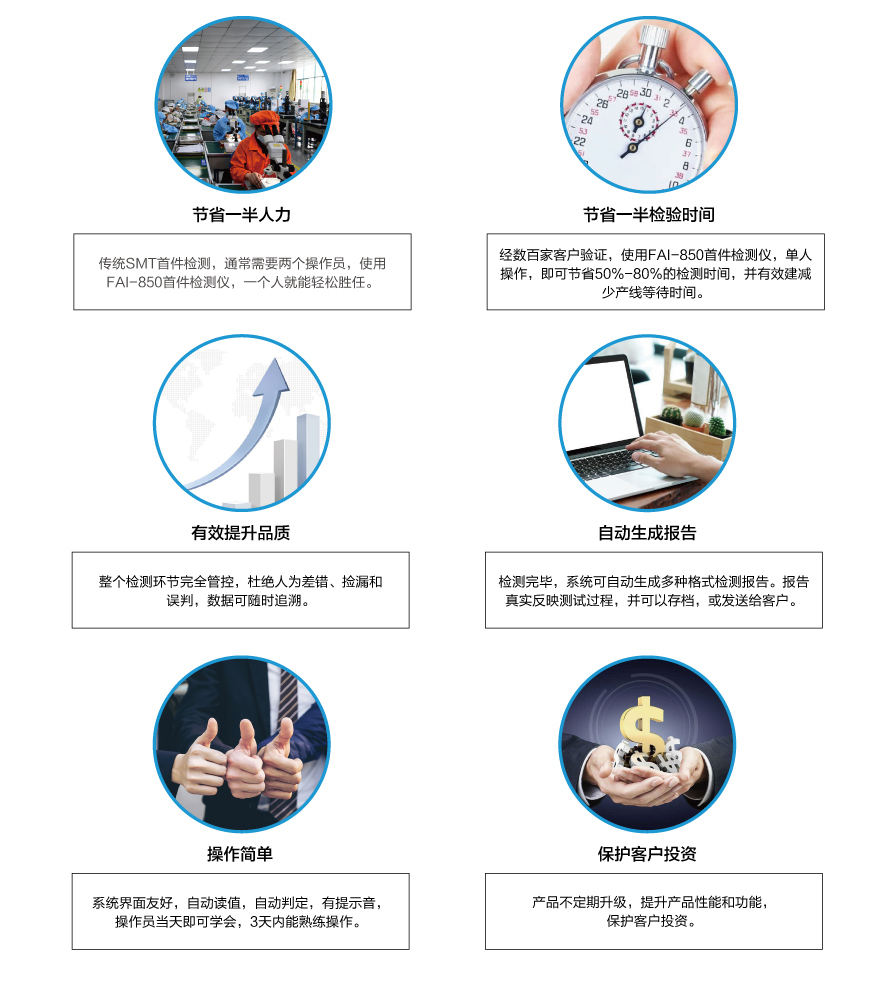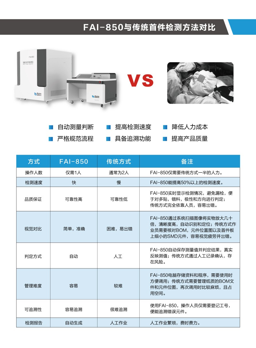 當(dāng)今SMT電子工廠,多機(jī)種、小批量、換線頻,使得首件檢測的任務(wù)越發(fā)繁重。傳統(tǒng)的SMT首件檢測方法,不僅浪費(fèi)人力,效率低下,整個首件檢測過程缺乏管控,品質(zhì)難以得到保證。針對此難題,深圳市藍(lán)眼科技有限公司首創(chuàng)了SMT首件檢測儀,通過不斷升級優(yōu)化,現(xiàn)已研發(fā)出第四代首件檢測儀FAI-850,具有以下顯著優(yōu)勢: