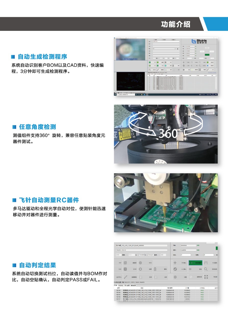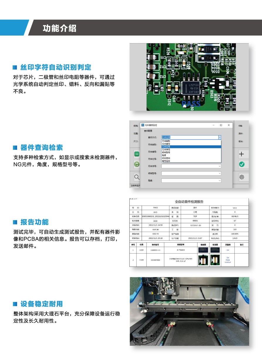 | 設備功能 | 自動測值、絲印、元件錯、漏、反及多件檢查 |